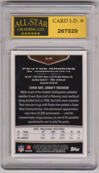 This is a Peyton Manning 2009 Bowman Chrome #12 card that has been graded a NM or higher 9 by ASG.  The holder has some surface scratches, but overall this is still a nice graded card of this NFL Hall of Famer.