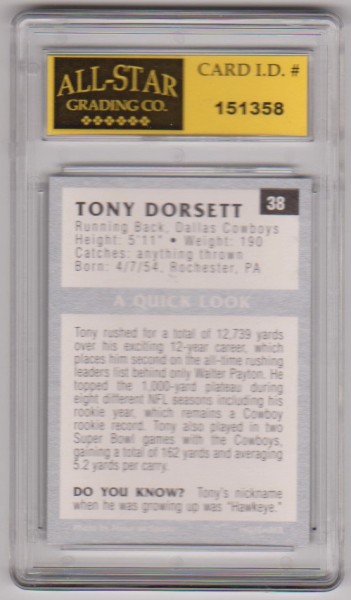 This is a Tony Dorsett 1991 Tuff Stuff Jr. #38 card that has been graded a NM or higher 9 by ASG.  The holder has some surface wear/scuffs, but overall this is a nice graded card of this NFL Hall of Famer.