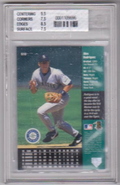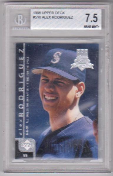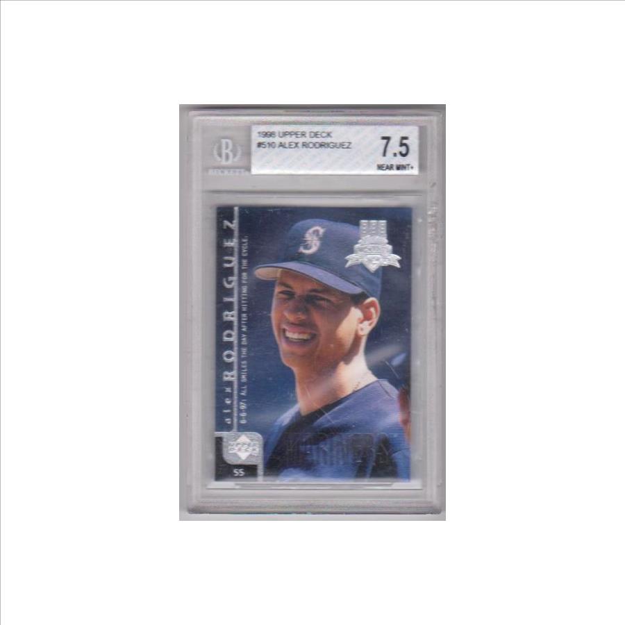 This is a 1998 Upper Deck Alex Rodriguez #510 card that has been graded a Near Mint+ 7.5 by BGS.  The holder has some light scuffs, but the card inside is not affected at all.  Overall, this is a nice graded A-Rod card.