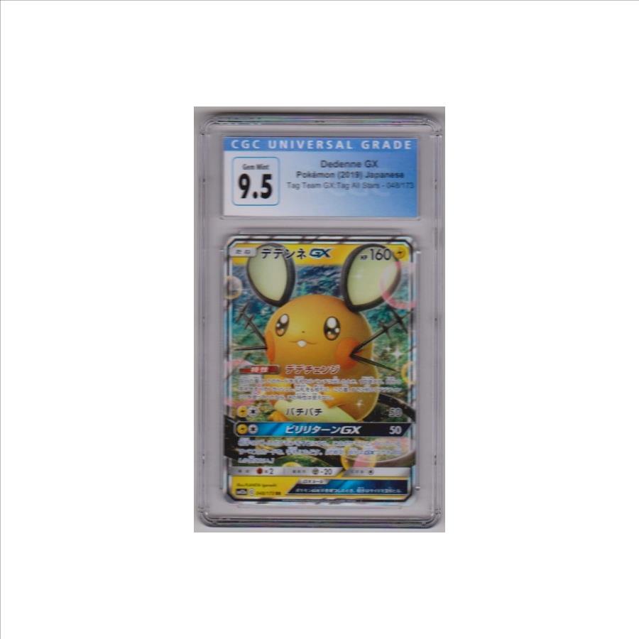 This is a Dedenne GX 2019 Pokemon Japanese Tag Team All Stars #048/173 card that has been graded a Gem Mint 9.5 by CGC Universal Grade.  The holder has some very minor surface wear, but overall this is a sharp graded Dedenne Japanese card.