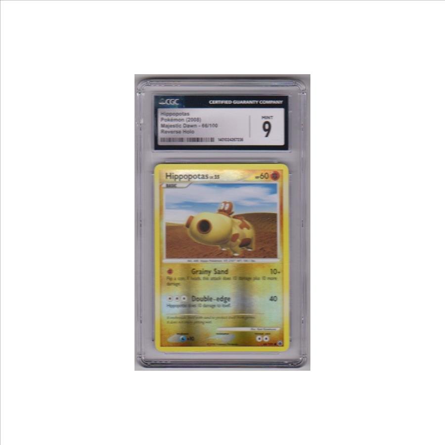 This is a Hippopotas 2008 Pokemon Majestic Dawn REVERSE HOLO #66/100 card that has been graded a Mint 9 by CGC.  The holder has light surface wear, but overall this is a sharp graded Pokemon card.