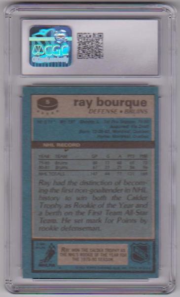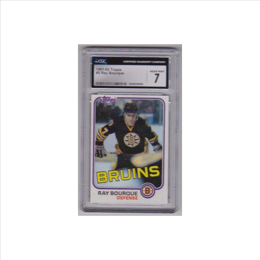 PropertyRoom.com's trusted merchant, Sports Collectibles, presents this online auction for the above Graded CGC NM 7 - Ray Bourque 1981-82 Topps #5 Card - HOF'er.