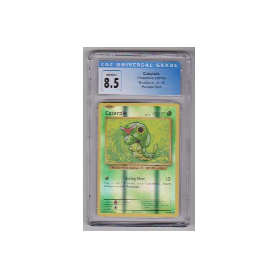 PropertyRoom.com's trusted merchant, Sports Collectibles, presents this online auction for the above Graded CGC NM/Mint+ 8.5 - Caterpie 2016 Pokemon REVERSE HOLO #3/108 Card.