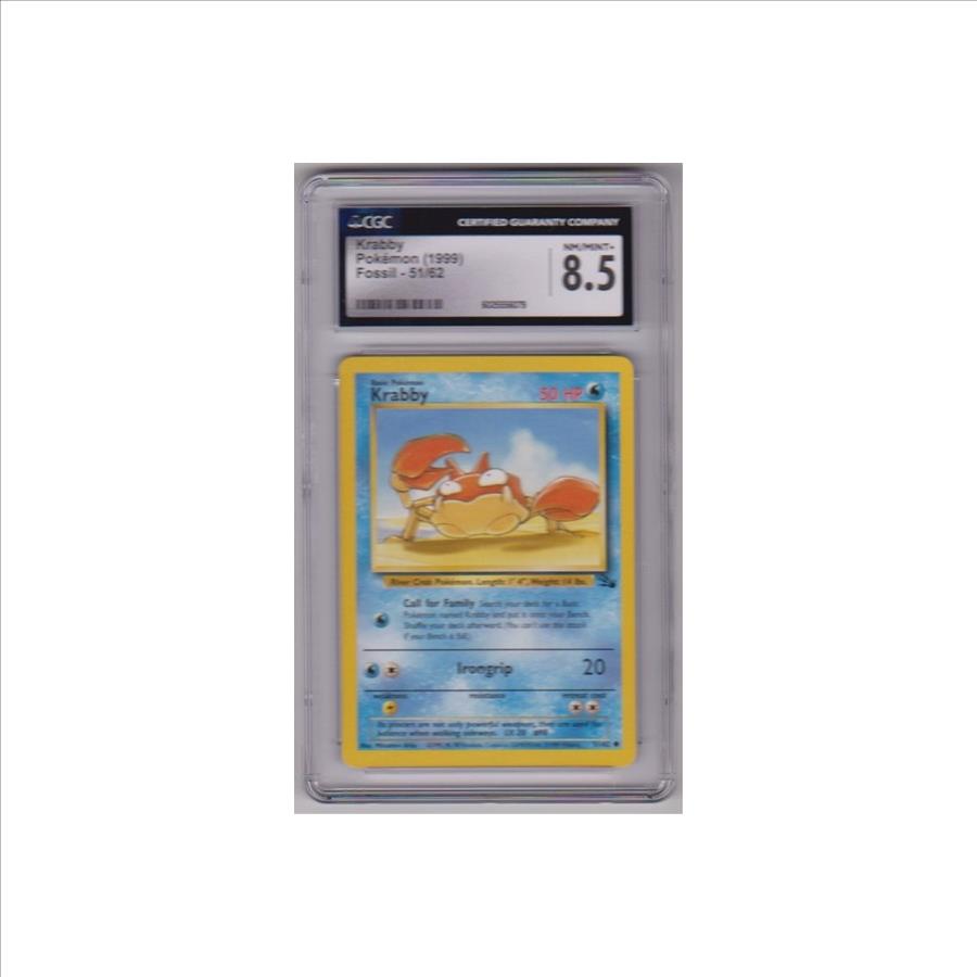 This is a Krabby 1999 Pokemon Fossil #51/62 card that has been graded a NM/Mint+ 8.5 by CGC.  The holder has minor wear, but overall this is a sharp graded vintage Pokemon card.