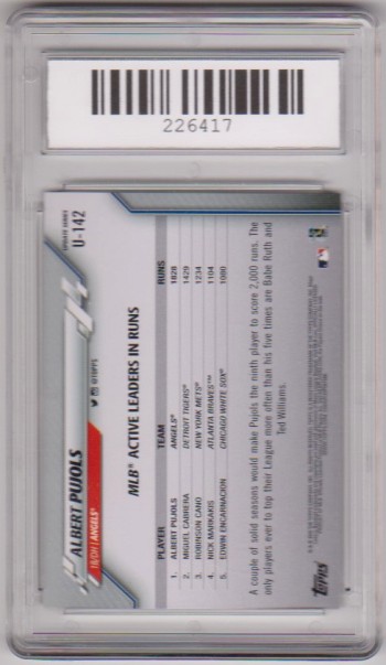 This is a Albert Pujols 2020 Topps Update #U-142 card that has been graded a Gem Mint 10 by SGS.  This is a sharp graded card of this future baseball Hall of Famer.