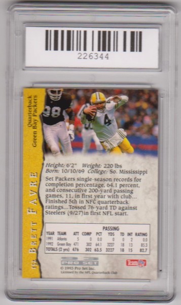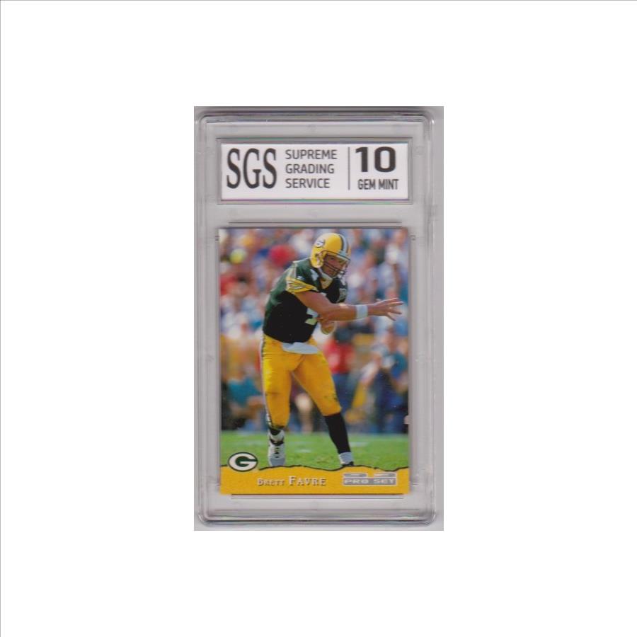 This is a Brett Favre 1993 Pro Set #152 card that has been graded a Gem Mint 10 by SGS.  This is a sharp graded card of this NFL Hall of Famer.
