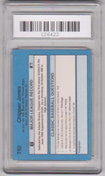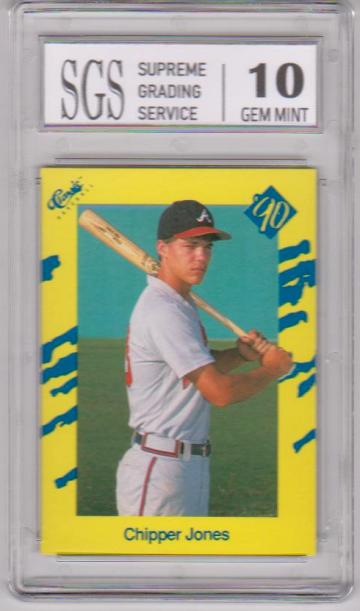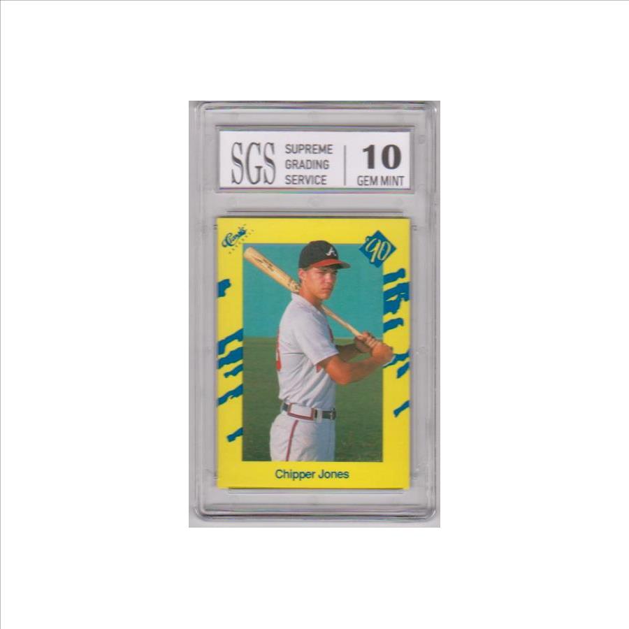 This is a Chipper Jones 1990 Classic #T92 Rookie Card that has been graded a Gem Mint 10 by SGS.  This is a sharp graded rookie card of this baseball Hall of Famer.