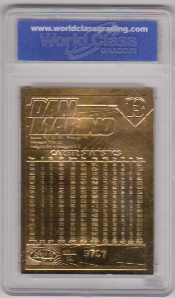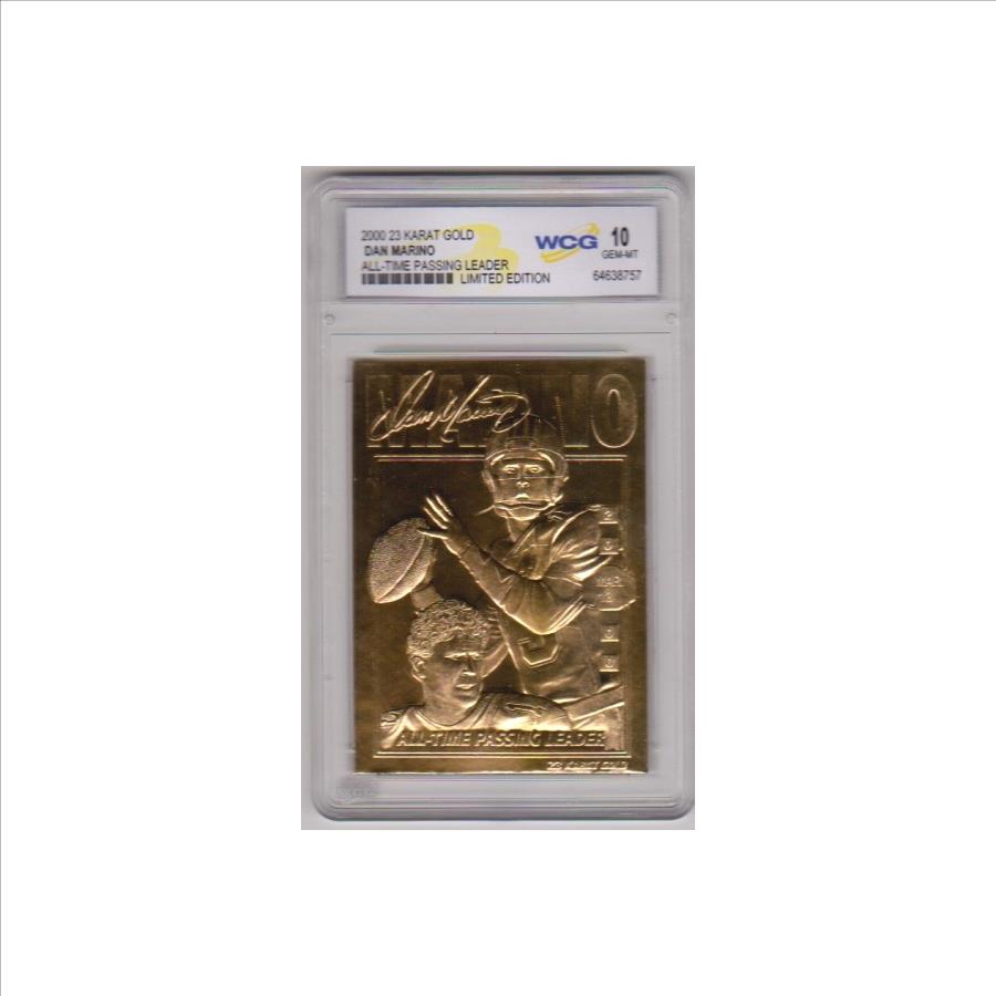 This is a 2000 Dan Marino 23 Kt Gold card that has been graded a Gem Mint 10 by WCG.  The holder has a couple of light surface scuffs on the front, but overall this is a sharp graded card of this NFL Hall of Famer.