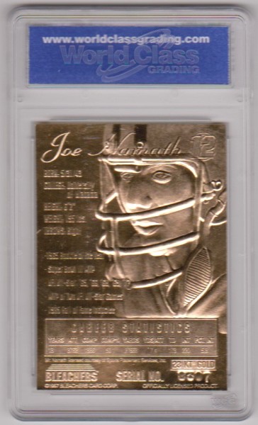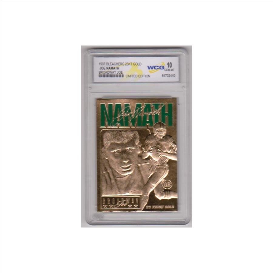 This is a 1997 Bleachers Joe Namath "Broadway Joe" Limited Edition 23kt Gold Foil card that has been graded a Gem Mint 10 by WCG. The holder has a couple of light surface scuffs on the front, but overall this is a sharp graded 23 Karat Gold card of this NFL Hall of Famer.