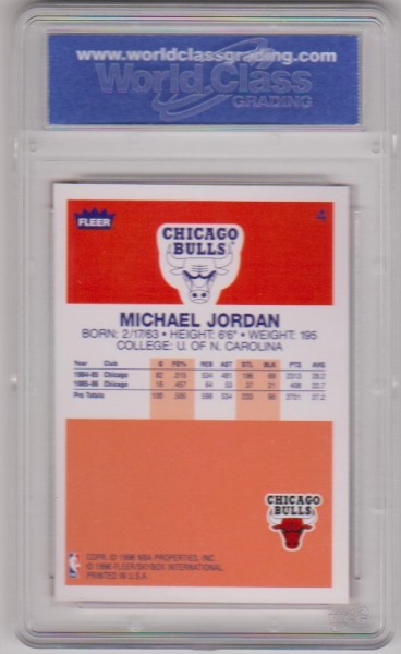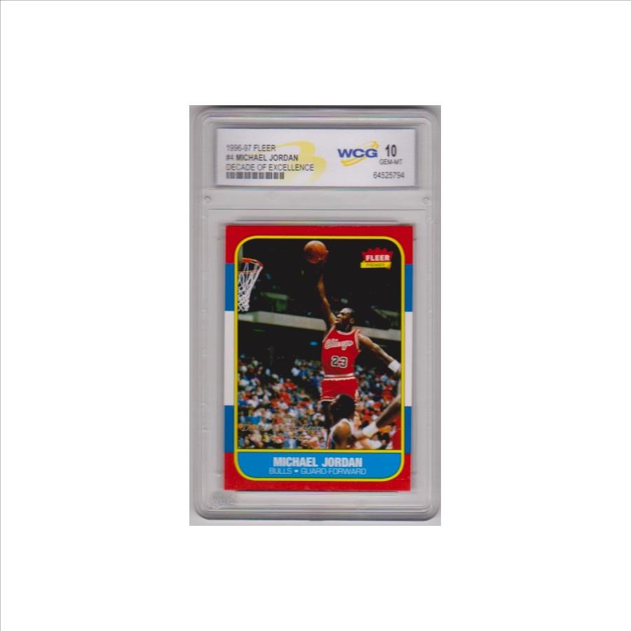 This is a 1996-97 Fleer Decade Of Excellence Michael Jordan #4 insert card that has been graded a Gem Mint 10 by WCG.  The holder has a couple of small light surface scuffs, but the card inside is not affected at all. Overall, this is a sharp graded card of this NBA Hall of Famer.