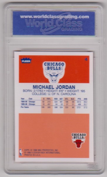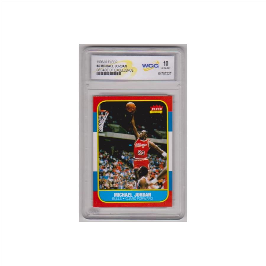 This is a 1996-97 Fleer Decade Of Excellence Michael Jordan #4 insert card that has been graded a Gem Mint 10 by WCG.  This is a sharp graded card of this NBA Hall of Famer.