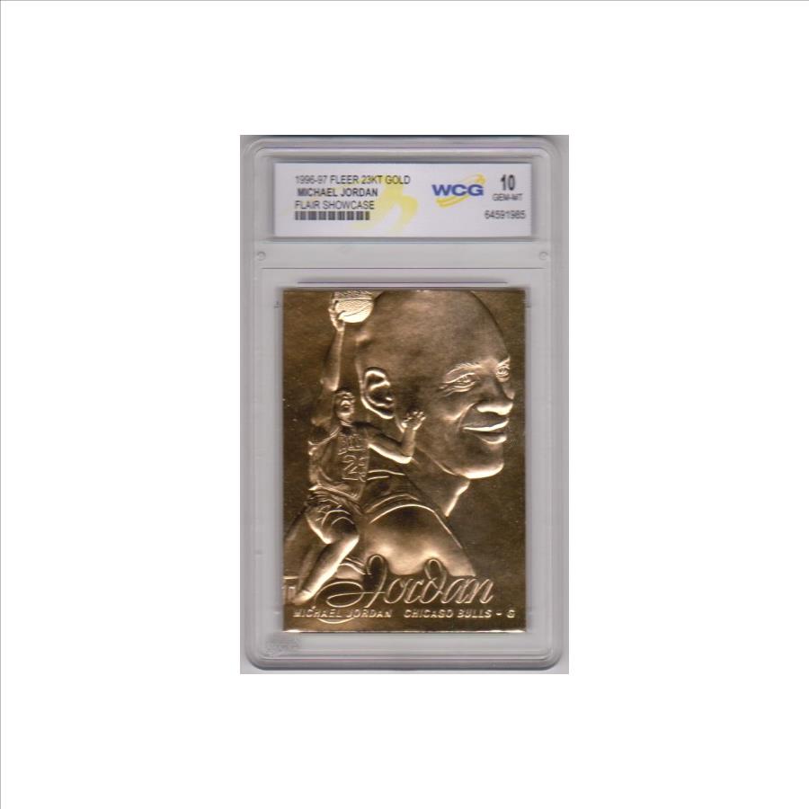 This is a 1996-97 Fleer Flair Showcase 23 Kt Gold Michael Jordan card that has been graded a Gem Mint 10 by WCG.  The holder has a couple small light surface scuffs on the front, but overall this is a sharp graded 23 Karat Gold card of this NBA Hall of Famer.