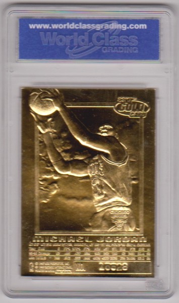 This is a 1996-97 Skybox EX-2000 Credentials Metallic Red Border Signature Series 23 Kt Gold Michael Jordan card that has been graded a Gem Mint 10 by WCG.  There are some light surface scuffs on the holder, but overall this is a sharp graded 23 Karat Gold card of this NBA Hall of Famer.