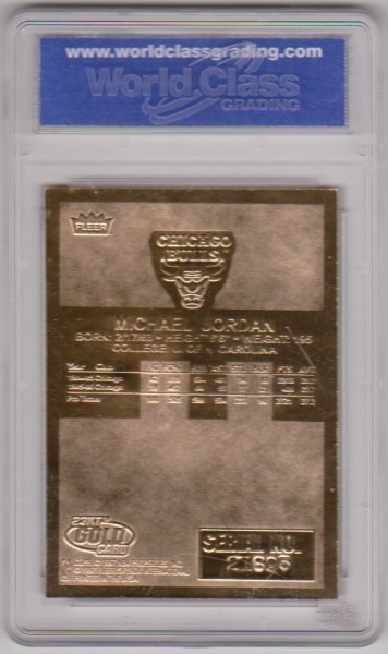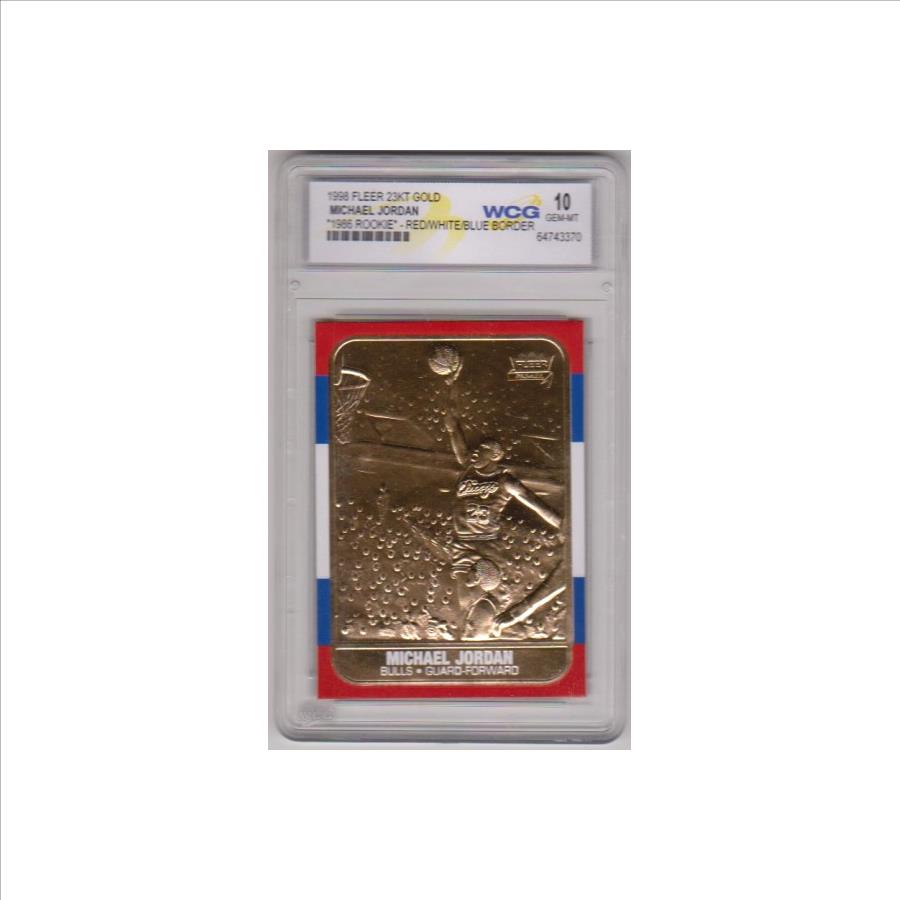 This is a 1998 Fleer 1986 Rookie Style Red/White/Blue Border 23 Kt Gold Michael Jordan card that has been graded a Gem Mint 10 by WCG.  The holder has a couple of small light surface scuffs on the front, but overall this is a sharp graded 23 Karat Gold card of this NBA Hall of Famer.