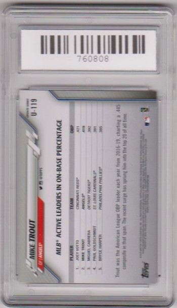 This is a Mike Trout 2020 Topps Update #U-119 card that has been graded a Gem Mint 10 by SGS.  This is a sharp graded card of this baseball All-Star.