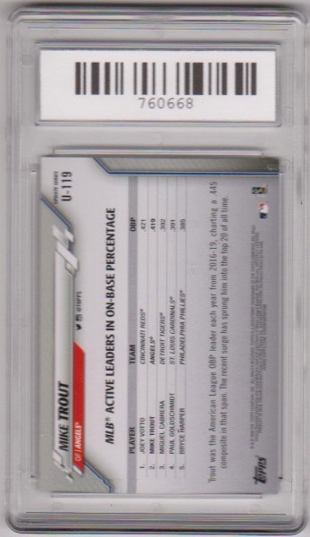 This is a Mike Trout 2020 Topps Update #U-119 card that has been graded a Gem Mint 10 by SGS.  This is a sharp graded card of this baseball All-Star.