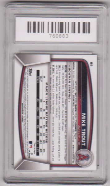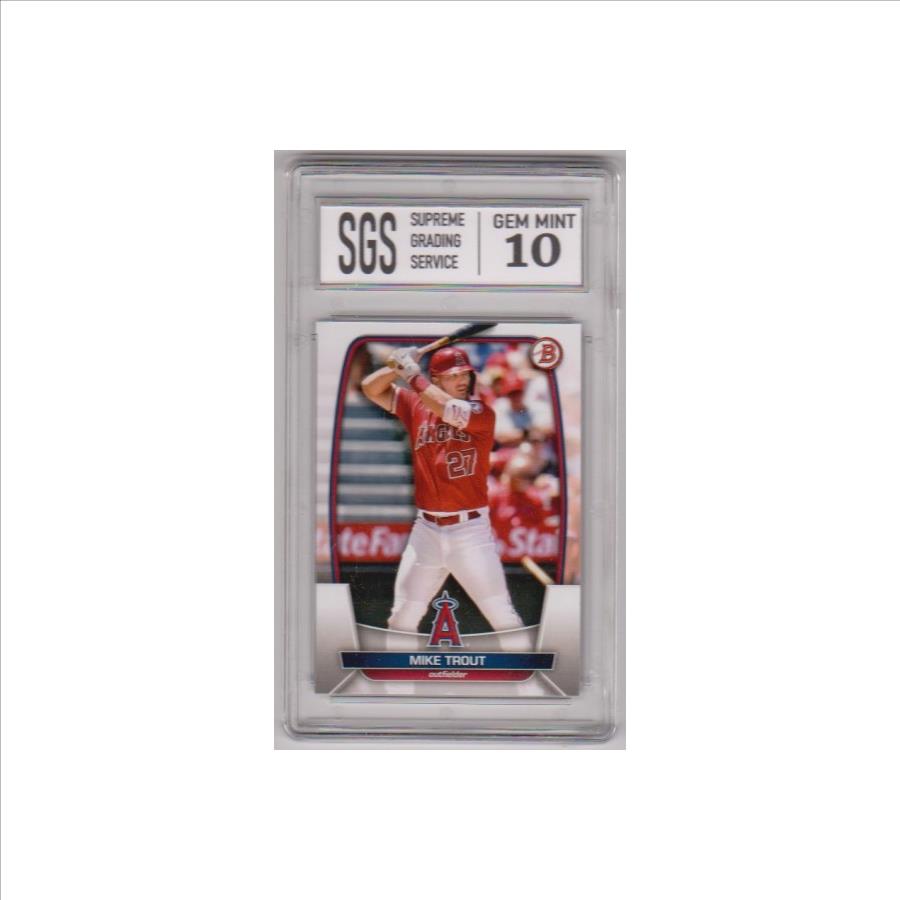This is a Mike Trout 2023 Bowman #89 card that has been graded a Gem Mint 10 by SGS.  The holder has some light surface wear, but overall this is a sharp graded card of this baseball star.