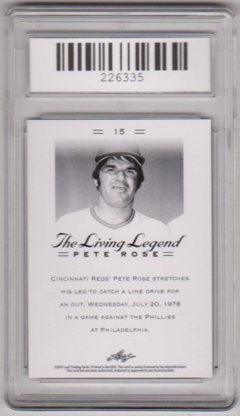 PropertyRoom.com's trusted merchant, Sports Collectibles, presents this online auction for the above Graded Gem Mint 10 -  Pete Rose 2012 Leaf The Living Legend #15 Card .
