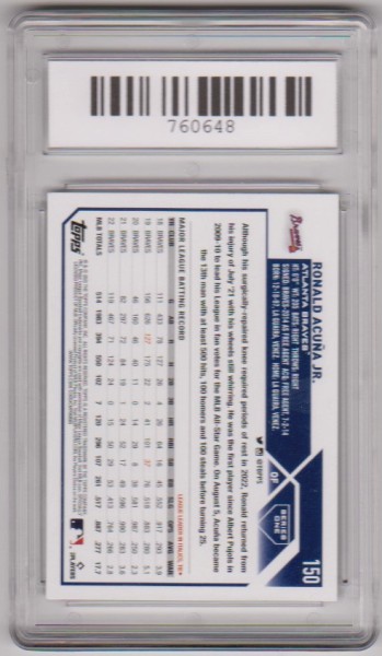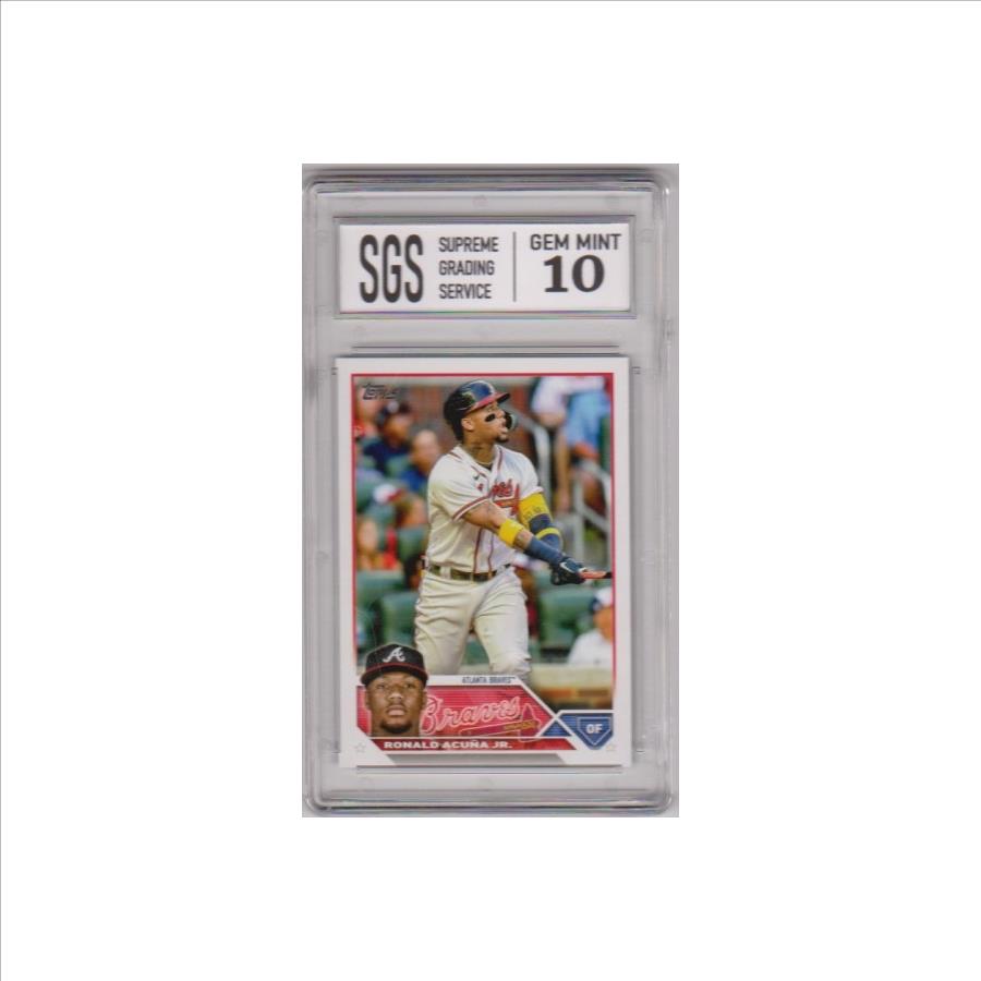 This is a Ronald Acuna Jr. 2023 Topps #150 card that has been graded a Gem Mint 10 by SGS.  There is a small light scratch on the front of the holder, but overall this is a sharp graded card of this baseball star.