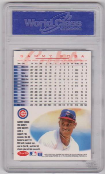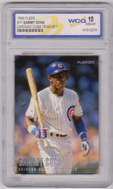 This is a Sammy Sosa 1996 Fleer Chicago Cubs Team Set #17/20 Card that has been graded a Gem Mint 10 by WCG. The holder has wear/scuffs but the card inside is not affected at all. Overall, this is a sharp graded card of this retired All-Star.