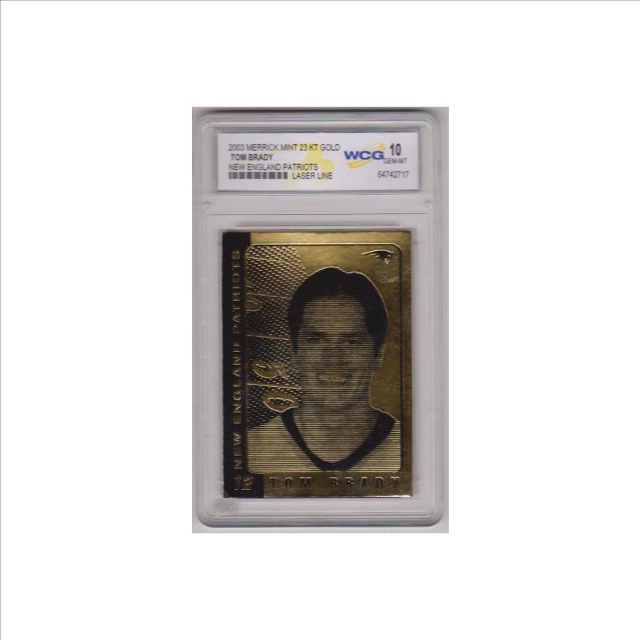 This is a 2003 Merrick Mint Laser Line Tom Brady 23 Kt Gold card that has been graded a Gem Mint 10 by WCG. There are a couple of light surface scuffs on the holder, but overall this is a sharp graded card of this future NFL Hall Of Famer.