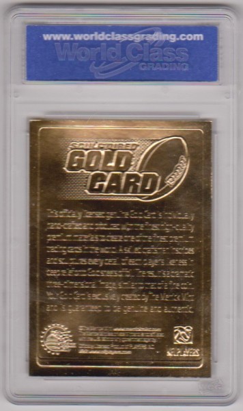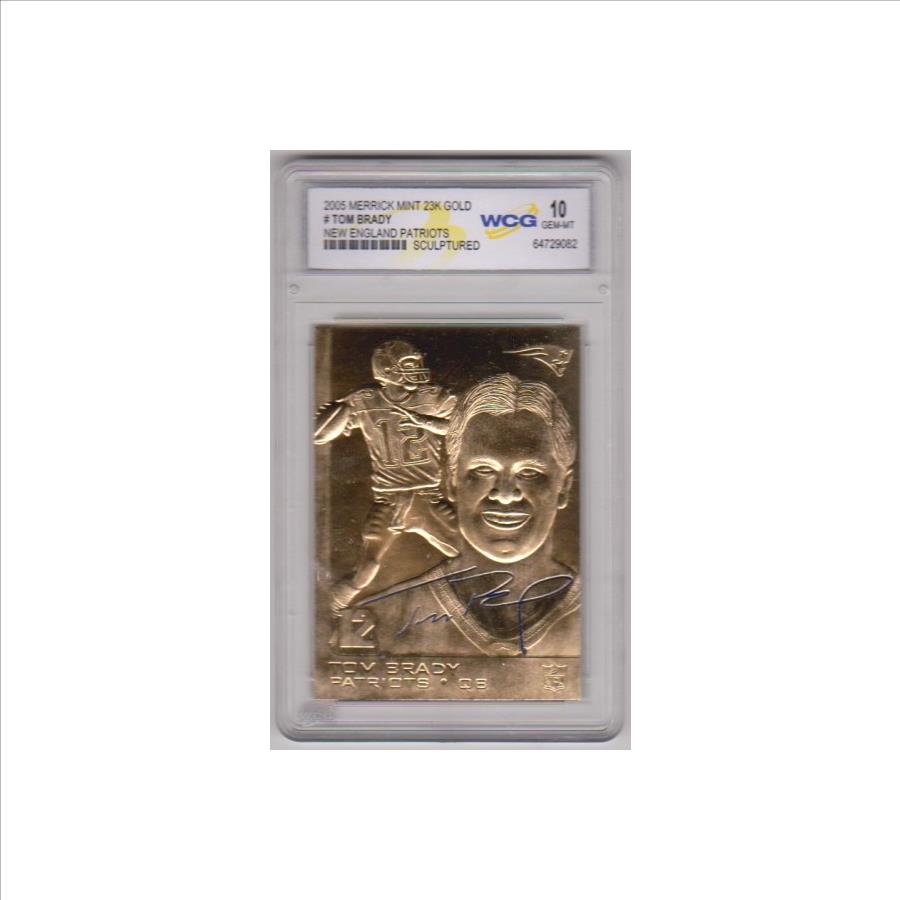 This is a 2005 Merrick Mint Tom Brady 23 Kt Gold card that has been graded a Gem Mint 10 by WCG.  The holder has a couple of small light surface scuffs, but overall this is a sharp graded card of this future NFL Hall Of Famer.