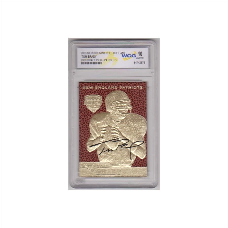 This is a 2006 Merrick Mint Feel The Game Tom Brady 2000 Draft Pick 23 Kt Gold card that has been graded a Gem Mint 10 by WCG.  There are a couple of small light surface scuffs on the front of the holder, but overall this is a sharp graded card of this retired NFL star.