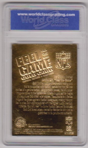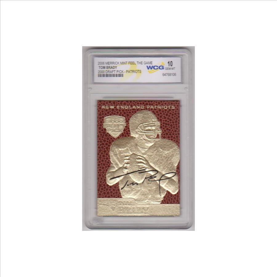 This is a 2006 Merrick Mint Feel The Game Tom Brady 2000 Draft Pick 23 Kt Gold card that has been graded a Gem Mint 10 by WCG.  There are a couple of small light surface scuffs on the front of the holder, but overall this is a sharp graded card of this retired NFL star.
