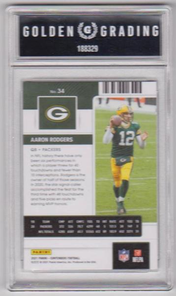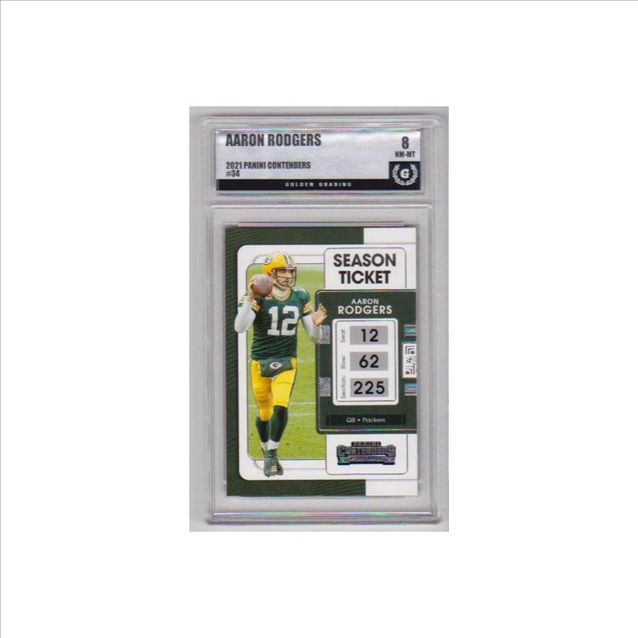This is a 2021 Panini Contenders Aaron Rodgers #34 card that has been graded a NM-MT 8 by Golden Grading. This is a sharp graded card of this NFL star.