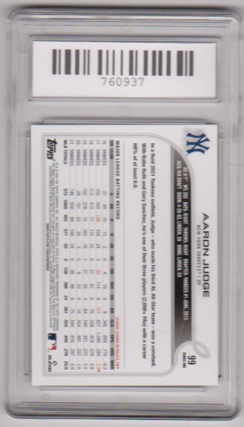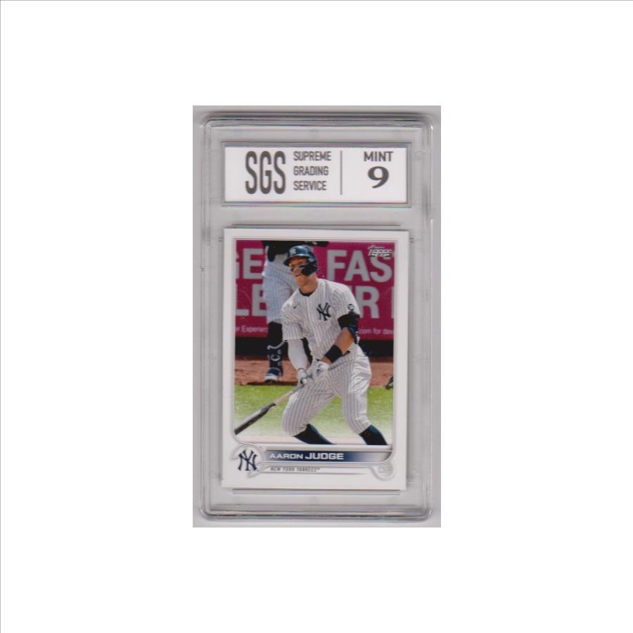 This is a 2022 Topps Aaron Judge #99 card that has been graded a Mint 9 by SGS.  The holder has some minor surface wear, but overall this is a sharp graded card of this New York Yankees baseball star.