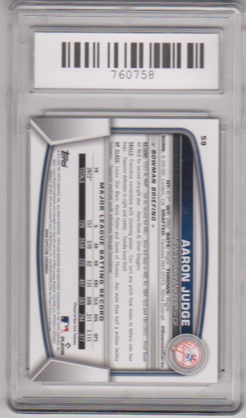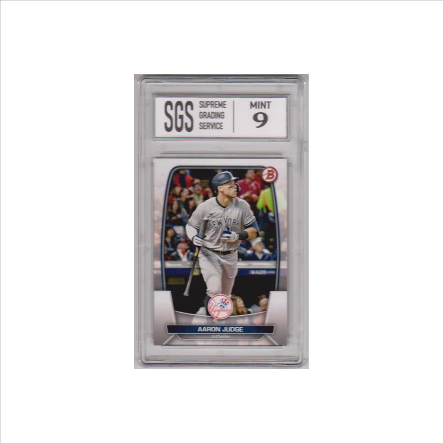 This is a 2023 Bowman Aaron Judge #59 card that has been graded a Mint 9 by SGS.  This is a sharp graded card of this New York Yankees baseball star.