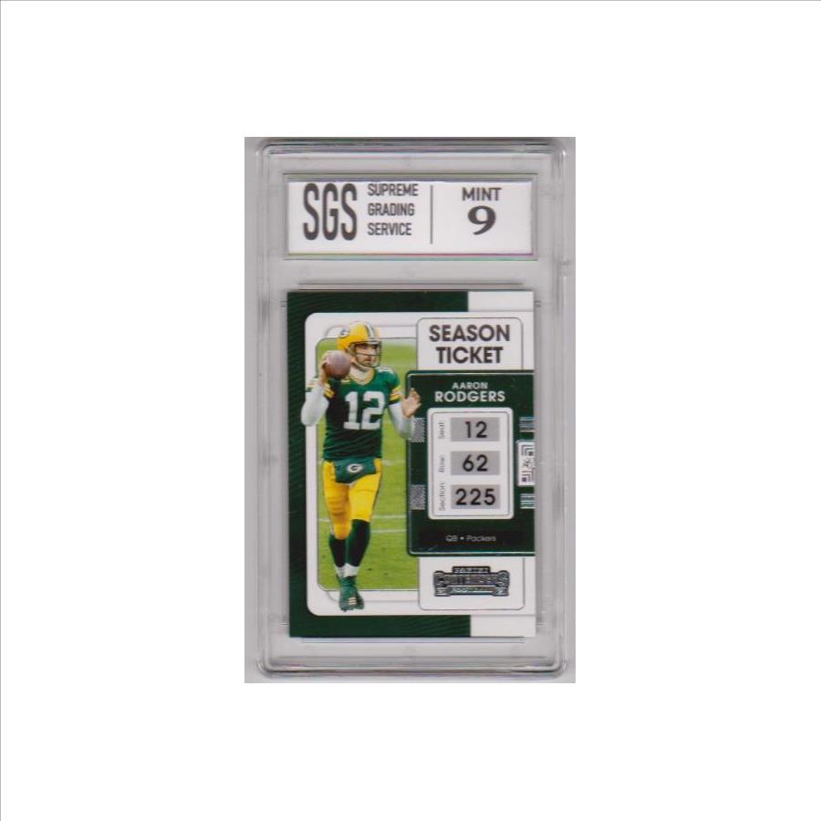This is a Aaron Rodgers 2021 Panini Contenders #34 card that has been graded a Mint 9 by SGS.  This is a sharp graded card of this NFL star.