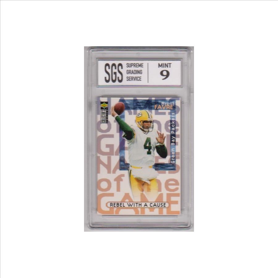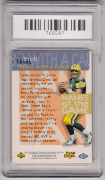 This is a Brett Favre 1997 Collector's Choice #71 card that has been graded a Mint 9 by SGS.  The holder has a couple of light surface scuffs, but overall this is a nice graded card of this NFL Hall of Famer.