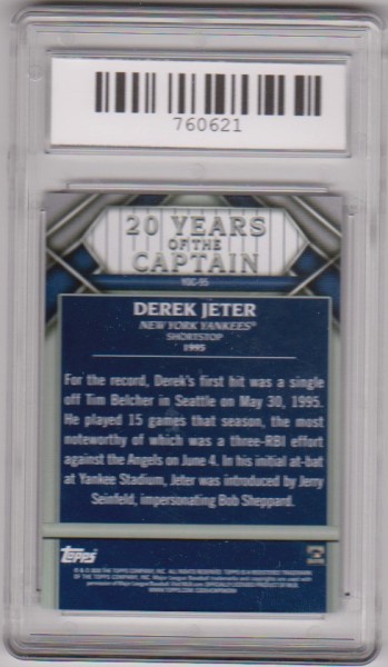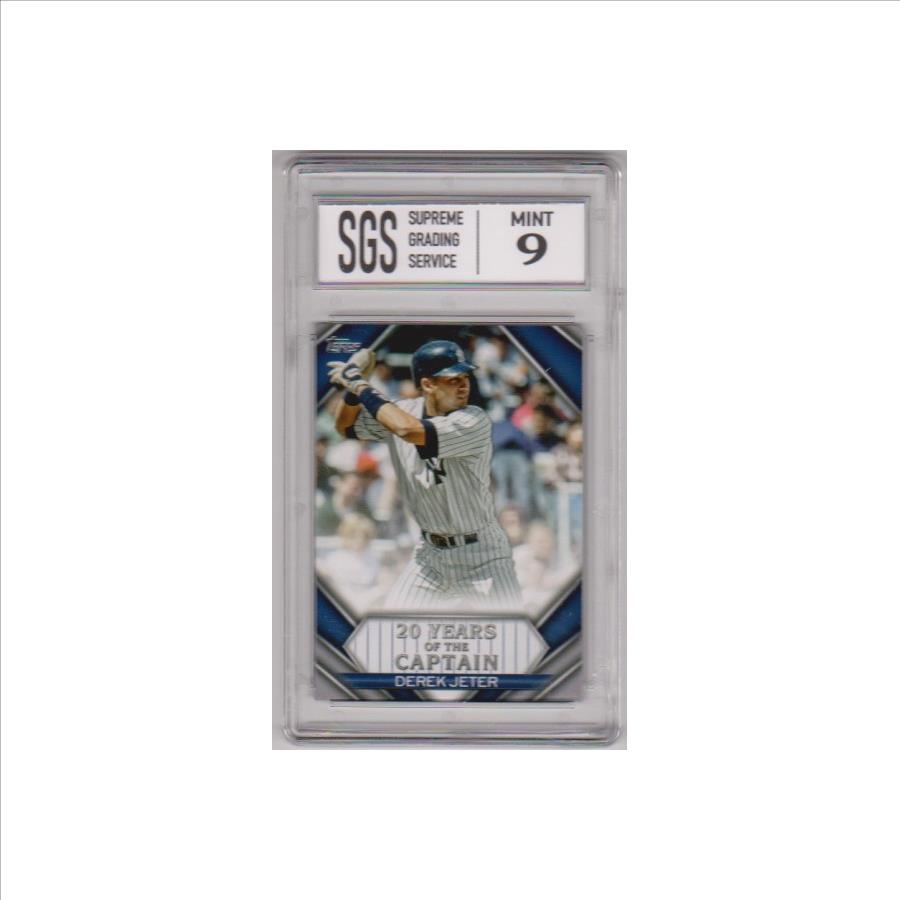 This is a Derek Jeter 2020 Topps 20 Years Of The Captain #YOC-95 card that has been graded a Mint 9 by SGS.  This is a sharp graded card of this baseball Hall of Famer.