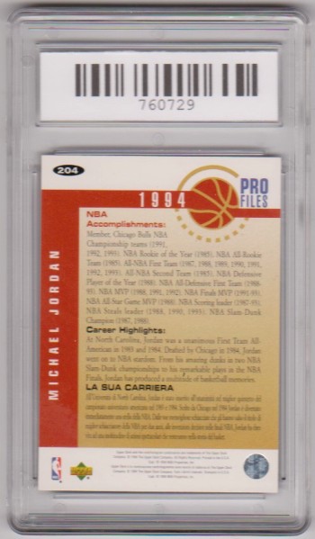 This is a 1994-95 Upper Deck Collector's Choice Italian Michael Jordan #204 card that has been graded a Mint 9 by SGS.  This is a sharp graded card of this NBA Hall of Famer.