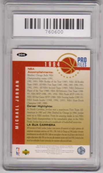This is a 1994-95 Upper Deck Collector's Choice Italian Michael Jordan #204 card that has been graded a Mint 9 by SGS.  This is a sharp graded card of this NBA Hall of Famer.