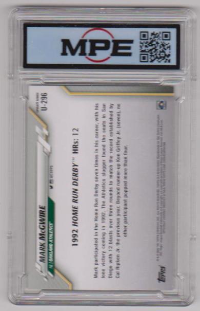 This is a Mark McGwire 2020 Topps Update #U-296 that has been graded a Gem Mint 10 by MPE. The holder has some light surface wear but overall this is a nice graded card of this retired baseball All-Star.