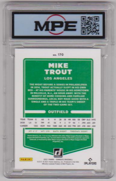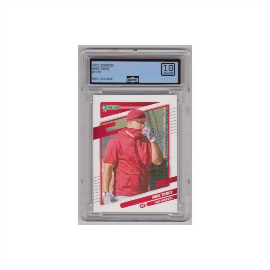 This is a Mike Trout 2021 Donruss #170 card that has been graded a Gem Mint 10 by MPE.  The holder has minor surface wear, but overall this is a sharp graded card of this baseball star.