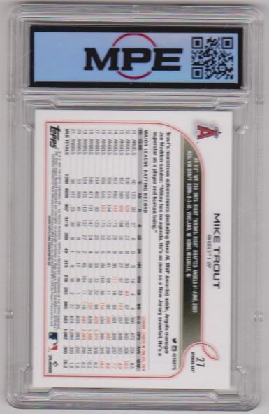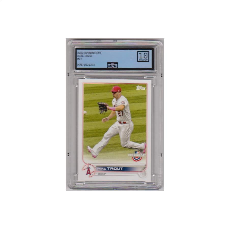This is a Mike Trout 2022 Topps Opening Day #27 card that has been graded a Gem Mint 10 by MPE.  The holder has some very light surface wear, but overall this is a sharp graded card of this baseball star.