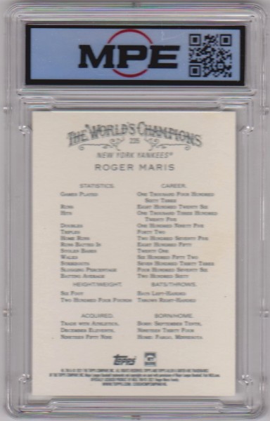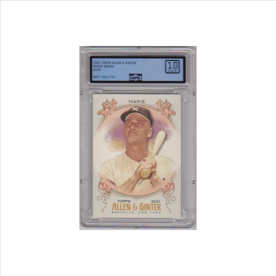 This is a Roger Maris 2021 Topps Allen & Ginter #235 card that has been graded a Gem Mint 10 by MPE.  The holder has some light surface wear, but overall this is a nice graded card of the man best known for breaking Babe Ruth's single season home run record in 1961.