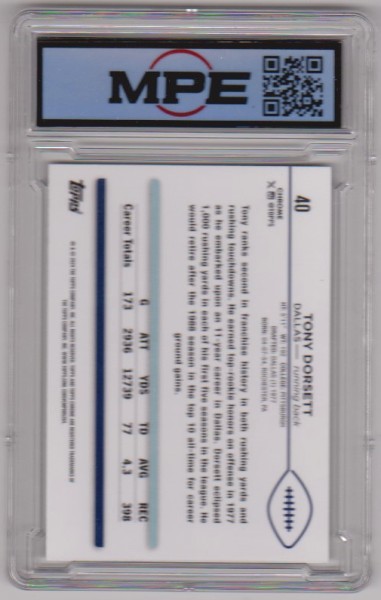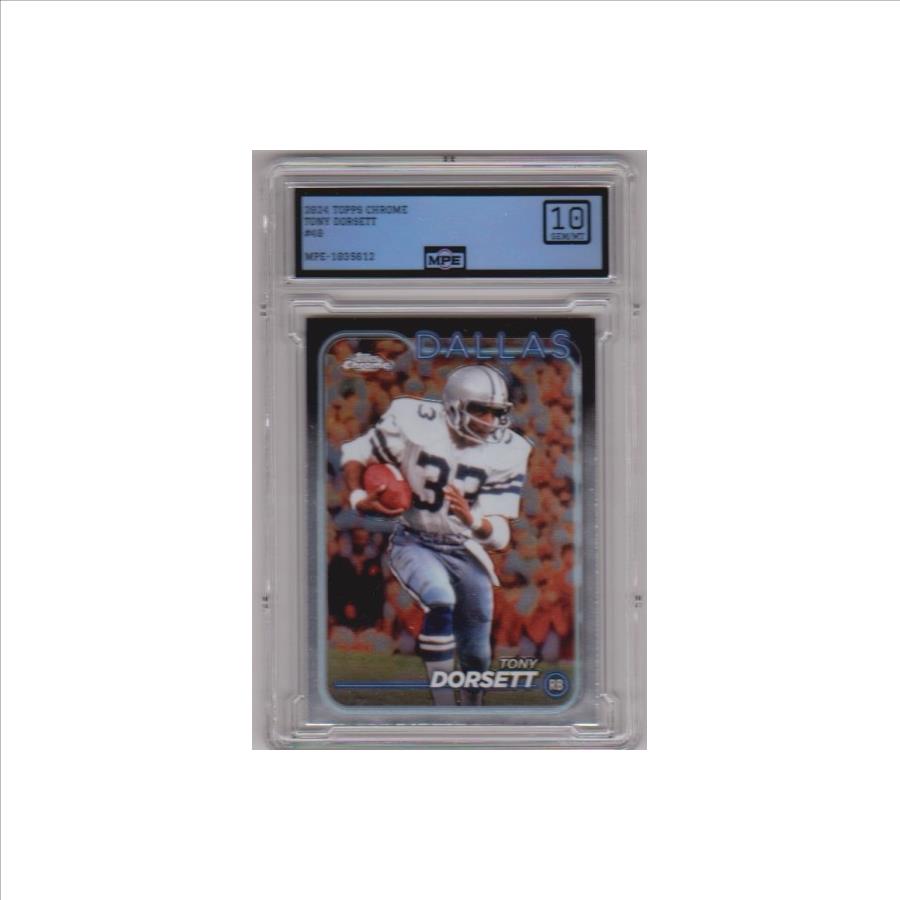 This is a Tony Dorsett 2024 Topps Chrome #40 card that has been graded a Gem Mint 10 by MPE.  This is a nice graded card of this NFL Hall of Famer.