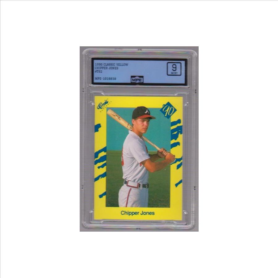 This is a Chipper Jones 1990 Classic #T92 Rookie Card that has been graded a Mint 9 by MPE.  The holder has light surface wear, but overall this is a sharp graded rookie card of this baseball Hall of Famer.