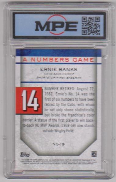 This is a Ernie Banks 2020 Topps A Numbers Game #NG-19 Insert card that has been graded a Mint 9 by MPE. This is a sharp graded card of this baseball Hall of Famer.