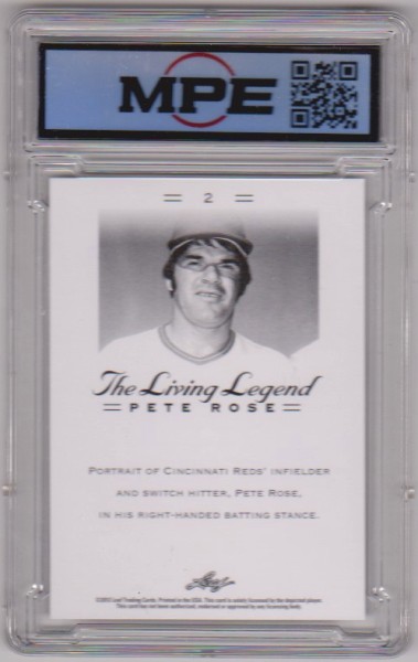 This is a Pete Rose 2012 Leaf The Living Legend #2 card that has been graded a Mint 9 by MPE. The holder has some surface wear/scuffs, but overall this is a sharp graded card of baseball's all-time hits leader.