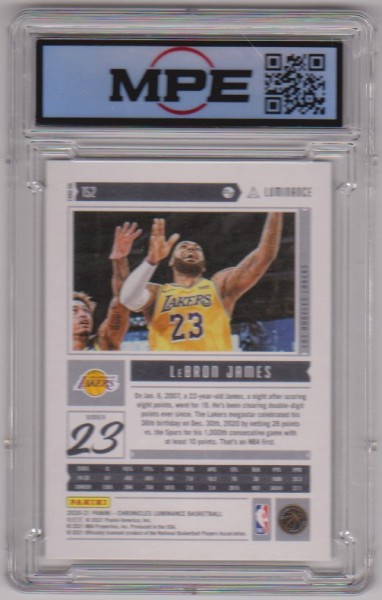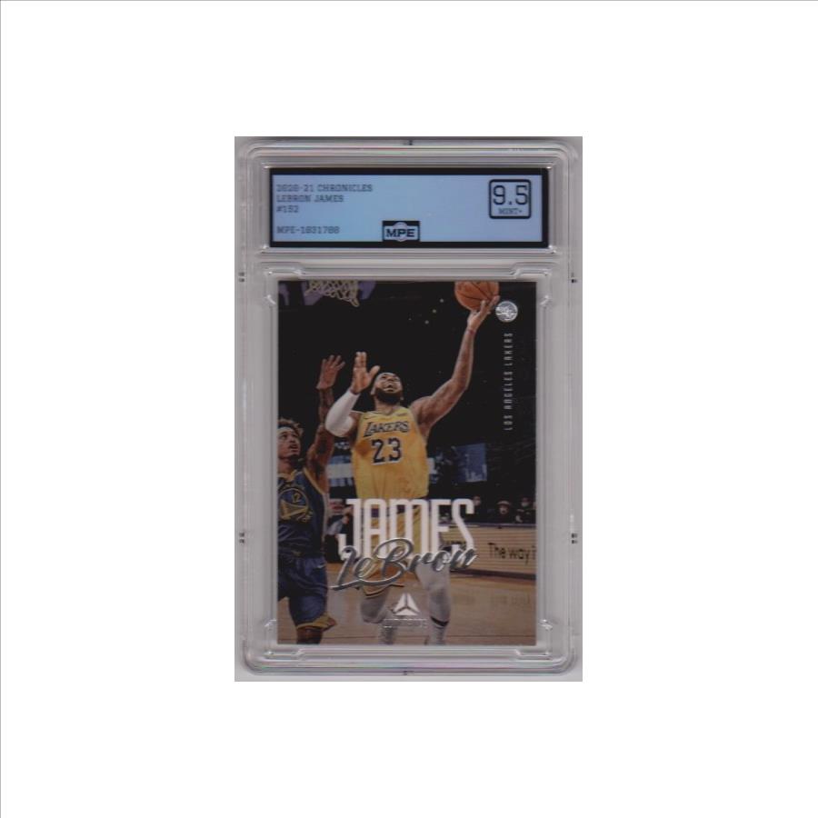 This is a Lebron James 2020-21 Panini Chronicles Luminance #152 card that has been graded a Mint+ 9.5 by MPE. The holder has some light surface wear, but overall this is a nice graded card of this NBA star.