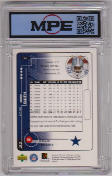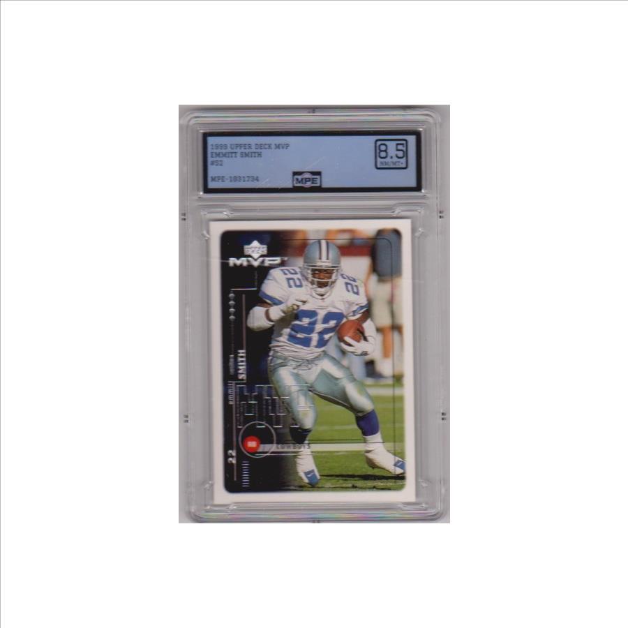 This is a Emmitt Smith 1999 Upper Deck MVP #52 card that has been graded a NM-MT+ 8.5 by MPE.  The holder has some surface scuffs, but overall this is a sharp graded card of this NFL Hall of Famer.