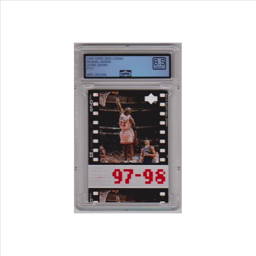 This is a Michael Jordan 1998 Upper Deck Living Legend #117 card that has been graded a NM-MT+ 8.5 by MPE.  The holder has some light surface wear, but overall this is a sharp graded card of this NBA Hall of Famer.