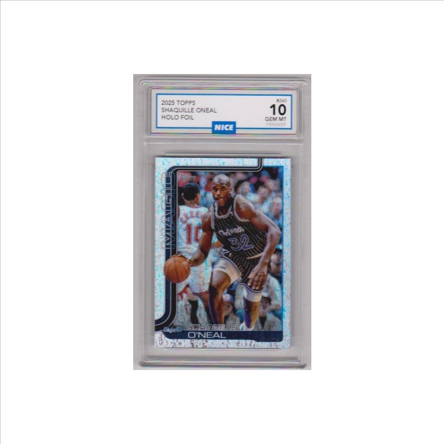 This is a Shaquille O'Neal 2025 Topps Holo Foil #260 card that has been graded a Gem Mint 10 by Nice Grading.  The holder has some surface wear/scuffs, but overall this is a sharp card of this basketball Hall of Famer.