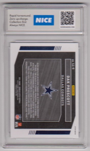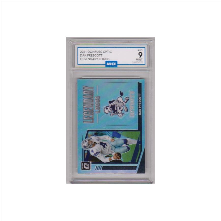 This is a Dak Prescott 2021 Donruss Optic Legendary Logos #LL-5 Insert  card that has been graded a Mint 9 by Nice Grading.  The holder has some surface wear, but overall this is a sharp graded card of this NFL star.