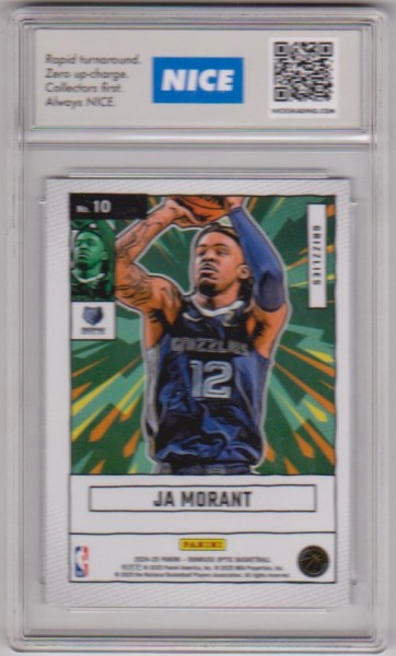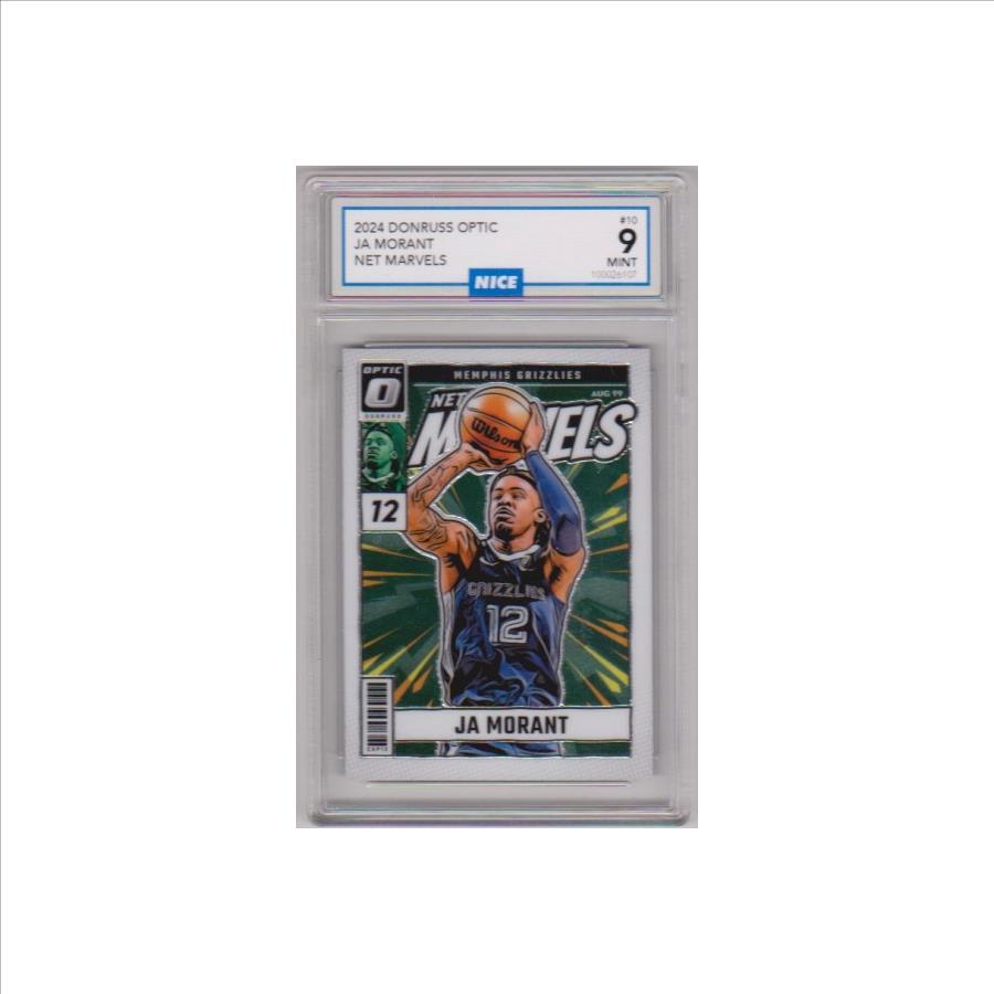 This is a JA Morant 2024-25 Donruss Optic Net Marvels #10 card that has been graded a Mint 9 by Nice Grading.  The holder has some surface scuffs, but overall this is a nice looking graded card of this NBA star.